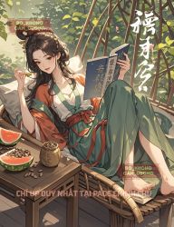 Nằm thoải mái trên chiếc ghế trúc kẽo kẹt ngoài sân, bên cạnh là cái bàn nhỏ đặt nửa cái bánh vừng ăn dở.